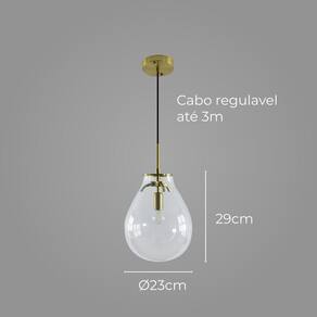 Pendente Caju! Este pendente é mais uma bela peça em metal e vidro, com certeza completa seu ambiente com bom gosto e requinte. Um toque de beleza que valoriza sua casa. ESPECIFICAÇÕES TÉCNICAS: Marca: Bella Modelo:CAJ1PD01TR029 Cor: Transparente e dourado Material: metal e vidro Tipo de Soquete: e14 Número de soquetes: 1 Tipo de lâmpada que utiliza: LED ou Halógena (não inclusa) Voltagem: Bivolt Potência em Watts: 40w Grau de Proteção: (IP20. IP65 .... etc) Indicado para uso: Interno Largura: 23cm Altura: 29cm Profundidade: 23cm Comprimento do Cabo: Cabo regulável até 3m Dimensões da Canopla: 12cm Peso líquido: 2300g Garantia: 12 meses Não Dimerizável