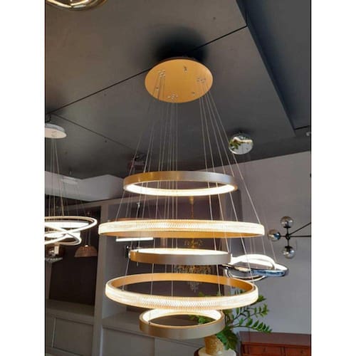 Pendente com círculos em led e estrutura em alumínio bronze. Dimensões dos círculos 80 e 60 cm de diâmetro. Altura total 2 metros. Led 3000k(amarelo) 116w