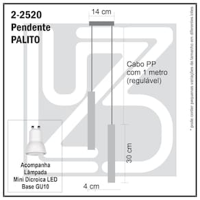 Pendente Palito DuploCom Design Slim este pendente é simples e lindo ao mesmo tempo. Proporciona uma luz focada e suave. Com cabo PP de 1 metro, regulador e canopla em metal esta luminária é uma tendência na iluminação. Descrição Técnica:- Modelo: PALITO DUPLO- Acabamento do corpo: PRETO- Material: Alumínio Usinado- Lâmpada: 1 lâmpada LED Mini Dicroica com 3w - 2700k- Tamanho (LxAxP): 4cm x 30cm x 4cm - Cabo: PP com 1m (regulável)- Cor do Cabo: PRETO- Soquete: GU 10- Bivolt: Sim- Canopla: Em metal com 14cm, modelo plano e trava cabo regulador do cabo.