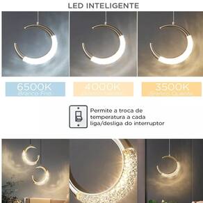 O Pendente Lua Minguante é ideal para decorar quarto, lavabos, seu design traz uma essência delicada e sofisticada. Com seu LED Inteligente é possível alternar eu tom de temperatura a cada liga e desliga do , podendo transformar seu ambiente conforme a necessidade do ambiente/momento. Especificações: Potência: 7W Temperatura de cor: 3500K Branco Quente, 4000K - Branco Neutro e 6500K Branco Frio Cor: Dourado Voltagem: Bivolt Led Driver Integrado Material: Acrílico e Metal Cabo Silicone Ajustável Dimensões: Diâmetro: 20cm Largura: 4cm Fio: 95cm Ajustável Canopla: 10cm Peso: 469g Acompanha: 01 Pendente Lua minguante : Oferecemos de 90 dias para todos os produtos. Havendo qualquer anormalidade com a peça durante esse período, nos prontificaremos a substituí-la o quanto antes, basta o cliente entrar em contato com nossa central de atendimento. Foto Ilustrativa Não nos responsabilizamos pelo mau uso do produto. Marca: Não Informado