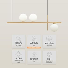 transforme seu ambiente com o pendente pd 6095, um modelo sofisticado que combina design moderno e iluminação eficiente. Seu acabamento em alumínio champagne proporciona um toque elegante e contemporâneo para qualquer espaço. Destaques do produto -com um design moderno e sofisticado - combinando com qualquer decoração e ambiente. -modelo : pd 6095. -cor es : champagne pintura pó . -material de alta qualidade : feita com um alumínio resistente para maior durabilidade. -compatível com lâmpadas led g9 -ideal para diferentes ambientes - perfeita para quartos, salas, escritórios e áreas gourmet. -peça com acionamento em instalado no ambiente. -modelo não recarregável. - de 3 meses. Especificações técnicas Pd 6095 g12 800x320x1500mm 3xg9 cp - op Material : alumínio Globo de vidro 12cm Cor : champagne Cabo de iluminação : 2 mts regulável Base canopla : 120 mm Soquete da luminária : g9 Número de lâmpadas : 3 lâmpadas lâmpada não inclusa Voltagem : 127v - 220v Medida : 800mm x 320mm x 1500mm Quantidade : 1 produtos. Observação : a lâmpada não acompanha o produto. O produto necessita de instalação elétrica para o funcionamento adequado. Conteúdo da embalagem : 1 luminária. Marca: Não Informado Ean: 7893313588081