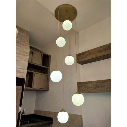 O Pendente Moderno Dourado Pé Direito Alto Sala Vão De Escada acompanha 6 globos de vidro, que completam o visual elegante e moderno da peça.