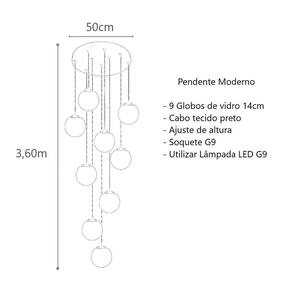 Feito de alumínio e vidro, esse pendente possui uma base de 50cm de diâmetro e uma altura total de 3,60m, ajustável de acordo com a sua preferência. Os 9 globos de vidro, com 14cm cada, proporcionam uma iluminação suave e agradável.