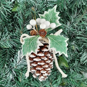 Adicione charme e elegância ao seu Natal com este pendente em formato de pinha nevada! Um enfeite sofisticado, perfeito para criar uma decoração acolhedora, festiva e cheia de estilo