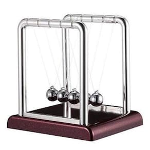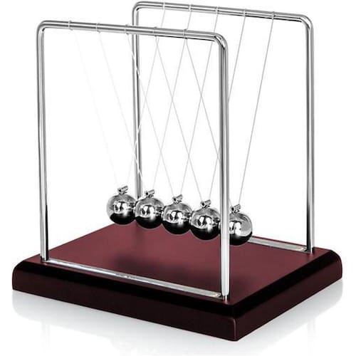 Pêndulo de Newton Decorativo Mesa de Escritório O pêndulo de Newton ou berço de Newton é um dispositivo que recebe o nome do físico Sir Isaac Newton por demonstrar empiricamente a conservação do momento e da energia, leis físicas estudadas e demonstradas por Newton. É construído a partir de uma série de pêndulos adjacentes uns dos outros. Cada pêndulo está anexado a uma armação por duas cordas de igual comprimento e ângulos opostos formados entre estas. Quando uma das esferas da ponta ("a primeira") é puxada para o lado, a corda ligada à esfera a faz realizar um arco para cima. Quando é solta, ela atinge a segunda esfera e praticamente para. A esfera da ponta oposta adquire a maior parte da velocidade da primeira esfera e balança em um arco quase tão alto quanto a altura de lançamento da primeira esfera. Características do produto:Cor: MarromMaterial: Metal e PlásticoTamanho: Altura de 18 cm Largura de 15cm e profundidade de 18cm