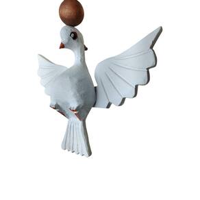 O destaque verdadeiramente notável é a pomba da paz esculpida à mão, símbolo emblemático do Espírito Santo. Cada detalhe das penas é esculpido com maestria, capturando a essência da paz e da tranquilidade que essa figura representa. Esta peça não é apenas um adorno, mas uma expressão tangível de espiritualidade, destinada a enriquecer o ambiente com sua presença significativa.