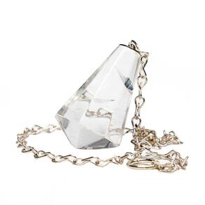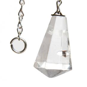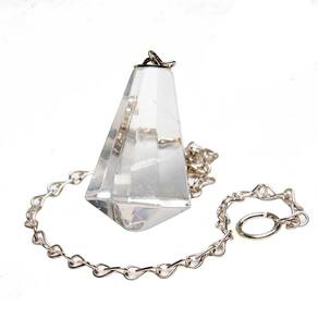 Pêndulo de Cristal Extra Transparência - Lapidação Piramidal Invertida Descrição do Produto: Transforme sua energia com o Pêndulo de Cristal Extra Transparência, lapidado de forma piramidal com a ponta invertida. Esta lapidação exclusiva proporciona um maior equilíbrio e precisão ao manipular o pêndulo, além de centralizar o peso no eixo, facilitando o uso para fins de radiestesia e cura energética. Benefícios do Cristal de Quartzo Hialino:\nCura e Harmonia: Ativa a cura do corpo físico e espiritual, proporcionando equilíbrio emocional. Purificação Energética: Neutraliza energias negativas no ambiente, promovendo um espaço limpo e harmonioso. Expansão da Mente: Abre caminhos para clareza mental, confiança e novas perspectivas. Harmonização da Aura: Limpa e energiza sua aura, oferecendo proteção contra influências externas indesejadas. Ambiente de Paz: Ideal para manter a harmonia e equilibrar as energias de qualquer ambiente.\nCaracterísticas do Produto:\nNome da Pedra: Quartzo Hialino (Cristal Extra Transparente) Cor: Cristalino, Super Transparente Corte: Pêndulo Piramidal com Ponta Invertida (Lapidação Manual) Brilho e Claridade: Cristal de alta transparência e brilho excepcional Medidas: Aproximadamente 30mm Peso: Aproximadamente 10g Montagem: Tulipa colada + Corrente Banho Prata Origem: Pedra de RS, manufatura e lapidação CristaisdeCurvelo, MG\nNota Importante: Por se tratar de pedras naturais, podem ocorrer pequenas variações nas tonalidades e grafismos, além de inclusões que são características normais de cristais extraídos diretamente da natureza. Radiestesia e Radiônica: A Prática da Conexão Energética O Pêndulo de Cristal é uma ferramenta poderosa para quem deseja trabalhar com radiestesia e radiônica, práticas que captam e transmitem energias para promover cura e equilíbrio. A radiestesia, com o uso de instrumentos como o pêndulo, permite detectar radiações e energias que influenciam o ambiente e o corpo, ajudando a eliminar bloqueios emocionais e espirituais. O Pêndulo e a Radiestesia:\nHarmoniza o ambiente: Neutraliza energias negativas, criando espaços de tranquilidade e proteção. Favorece o autoconhecimento: Auxilia no desbloqueio mental e espiritual, promovendo clareza de pensamentos e ideias. Prática para todos: Embora seja uma arte e ciência, a radiestesia é acessível a qualquer pessoa, promovendo equilíbrio e saúde holística.\n Radiônica a Distância: Se você não pode estar fisicamente presente para realizar a análise energética, a radiônica permite o envio de energia a distância, utilizando o pêndulo para ajustar os campos energéticos, proporcionando cura e equilíbrio sem limites geográficos.