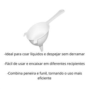 A Peneira de Plástico Grande com Funil Encaixável foi desenvolvida para oferecer máxima praticidade e precisão na hora de peneirar e transferir alimentos. Seu design inteligente 2 em 1 combina peneira e funil, permitindo coar líquidos, sucos, farinhas e grãos diretamente em garrafas ou recipientes, evitando sujeira e desperdício. Fabricada em plástico resistente e leve, é fácil de usar, lavar e guardar. Ideal para uso doméstico ou , esse utensílio é indispensável para quem busca agilidade, higiene e eficiência no preparo e armazenamento dos alimentos. Especificações: - Marca: Plasutil; - Modelo: 009164; - Com Alça: Sim; - Diâmetro: 15 cm; - Dimensões: 30 x 14,5 x 15,5 cm; - Cor: Branco; - Material: Polipropileno, Nylon; - Aplicação: Coar líquidos, peneirar ingredientes secos e despejar diretamente em recipientes estreitos; - Recomendações: Não usar com líquidos muito quentes, para evitar deformações no funil ou na peneira; - : 3 meses 90 dias . Conteúdo da embalagem: -01 Peneira de Plástico Grande com Funil Encaixável.