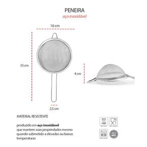 Contem: 1 Peneira Medidas: 16 x 33 x 4 cm Material: Aço Inox
