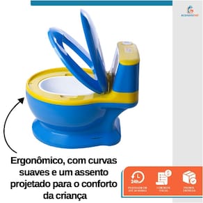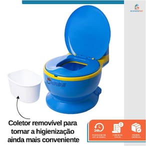 Principais características e benefícios Aparência realista: O design do penico se assemelha a um vaso sanitário, o que ajuda a criança a se familiarizar com o objeto e a entender sua função. Som interativo: A presença de um som de descarga torna o momento do uso do penico mais divertido e envolvente para a criança, incentivando-a a utilizá-lo. Reservatório removível: O reservatório interno pode ser facilmente removido para limpeza, o que torna a higienização do penico prática e rápida. Base antiderrapante: A base do penico é projetada para evitar que ele escorregue, garantindo a segurança da criança durante o uso. Espaço para lenços ou papel higiênico: O penico possui um compartimento para armazenar lenços umedecidos ou papel higiênico, o que facilita a higiene da criança.