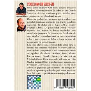 Pense como um Super-GM é uma parceria única que combina os conhecimentos de xadrez de um Grande Mestre de elite com uma investigação científica sobre o pensamento no tabuleiro de xadrez. Quarenta quebra-cabeças foram apresentados a um painel de jogadores, composto por simples jogadores ocasionais de clubes até o Super-GM e coautor Michael Adams. O pesquisador Philip Hurtado registrou não apenas os lances escolhidos, mas também os processos de pensamento detalhados de cada jogador, com o objetivo de esclarecer o mistério sobre o que exatamente define a força superior de pensamento no jogo de xadrez. Este livro oferece uma oportunidade única para os leitores não somente resolverem os quebra-cabeças, mas também compararem o seu pensamento com o de jogadores de clubes, amadores fortes, Mestres Internacionais, Grandes Mestres e do próprio Michael Adams. Com uma seção adicional de oito Quebra-cabeças Bônus e um fascinante experimento Eyetracker (rastreamento ocular) que mostra onde diferentes jogadores concentraram sua atenção no tabuleiro a gerar mapas de calor posicionais, este é um livro único para o aperfeiçoamento no jogo de xadrez.