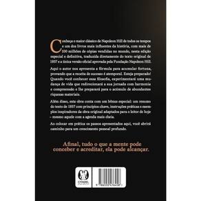 Conheça o maior clássico de Napoleon Hill de todos os tempos e um dos livros mais influentes da história, com mais de 100 milhões de cópias vendidas no mundo, nesta edição especial e definitiva, traduzida diretamente do texto autêntico de 1937 e a única versão oficial aprovada pela Fundação Napoleon Hill. Aqui o autor nos apresenta a fórmula para acumular fortuna, provando que a receita de sucesso é atemporal. Esteja preparado! Quando você conhecer essa filosofia, experimentará uma mudança de vida que redirecionará a sua jornada com harmonia e compreensão e lhe preparará para o acúmulo de abundantes riquezas materiais. Além disso, esta obra conta com um bônus especial: um resumo do texto de 1937 com princípios-chave, instruções práticas e exemplos inspiradores da obra autêntico adaptados para o leitor de hoje – mesmo aquele com a agenda mais cheia. Ao colocar em prática os passos apresentados aqui, você abrirá caminho para um crescimento pessoal profundo. Afinal, tudo o que a mente pode conceber e acreditar, ela pode alcançar.