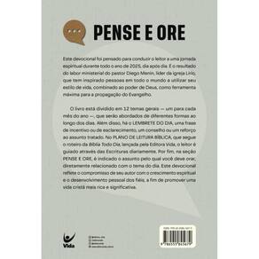 Pense e ore irá conduzi-lo a uma jornada espiritual durante todo o ano. Por meio da meditação diária na Palavra, você alcançará um novo nível de intimidade em seu relacionamento com o Senhor, e será surpreendido pelo agir de Deus em sua vida.O livro está dividido em 12 temas gerais, um para cada mês do ano. Além disso, em cada dia, você encontrará três seções importantes: o LEMBRETE DO DIA, com uma frase de incentivo, aconselhamento ou um reforço ao assunto tratado; o PLANO DE LEITURA BÍBLICA, que guiará você através das Escrituras; e a seção PENSE E ORE, que indica o tópico do dia pelo qual orar. Através desta obra cuidadosamente elaborada, você será capaz de desenvolver o seu caráter e crescer espiritualmente, a fim de desfrutar um ano de aprendizado e comunhão íntima com o Pai.