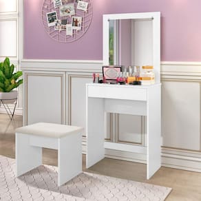 A penteadeira Sofia é ideal para você que quer organizar da melhor maneira todos os seus itens de maquiagem etc., sem ocupar muito espaço, de forma prática e eficiente. Possui uma gaveta logo abaixo do tampo, e 1 espelho na parte superior. Produzida em MDP e acabamento em pintura UV e verniz brilho de alta qualidade, contribuindo para maior durabilidade e resistência do produto. A banqueta é um item prático, compacto, elegante e indispensável na hora de se arrumar. Ideal para ser utilizado em penteadeiras, halls de entrada, ou para dar aquele "toque final" na decoração do ambiente. Estruturada em MDP, com pintura UV e acabamento verniz brilho, o que garante durabilidade, segurança e beleza ao móvel. Acabamento da Gaveta: Pintura UV Acompanha Banqueta: Sim Altura do Espelho: 55 cm Ambiente Principal: Quarto Complexidade da Montagem: Alta: deve ser montado por um montador especializado Cor: Branco Cor da Banqueta: Branco Cor do Produto: Branco Escala de Brilho: Brilhante Espessura do Espelho: 2 Formato do Espelho: Retangular Gaveta com Chave: Não Itens Inclusos: 1 Penteadeira, 1 Banqueta, Kit Ferragens e Manual de Montagem Largura do Espelho: 45 cm Manual de Montagem e Instalação: https://cdn2.madeiramadeira.com.br/atributo/j-a-moveis/1361784-penteadeira-sofia-com-banqueta.pdf Material da Banqueta: MDP Material da Gaveta: MDP Material Principal: MDP Medida da Banqueta: 50cm x 50cm x 34cm Necessita Montagem: Sim Origem do Produto: Nacional Peso: 25.2 Peso da Banqueta: 8.83 Peso Máximo por Gaveta: 5 Peso Suportado pela Banqueta: 40 Possui iluminação: Não Possui Moldura: Não Possui Pés: Não Possui Porta Objetos: Não Possui Portas: Não Possui Prateleiras: Não Quantidade de Espelho: 01 Recomendações de Uso, Manutenção e Limpeza: Limpar com pano seco, manter em lugar livre de umidade, ao abrigo de exposição direta ao sol. Sapatas Niveladoras: Sim Sistema de Montagem: Parafusos, Tampas, pregos Suporta Até (kg): 20 Tipo de Corrediça da Gaveta: Metálica Simples Tipo de Fixação do Espelho: Molduras Tipo de Puxador da Gaveta: Embutido