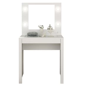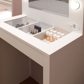 Características Material MDP Tampo com Vidro Espelho Kit Lâmpadas com Interruptor 10A Compartimento para Maquiagem e/ou Joias Acabamento em BP