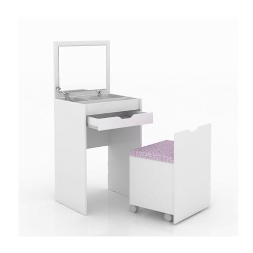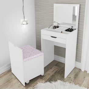 A Penteadeira Compacta PE2007 da Tecnomobili é ideal para você. Penteadeira compacta elegante cabe em qualquer mínimo espaço em casa. Possui puff baú encaixado à sua estrutura, uma gaveta e uma tampa com abertura em 90° com espelho colado ao fundo possibilitando extrema facilidade e organização na hora de se embelezar. É de grande utilidade para armazenagem de produtos de como: maquiagens, perfumes, cremes, pincéis de maquiagem, esmalte, sombra, blush, batom, rímel, joia, brinco, anel, base e demais produtos femininos, pois possui espaço interno com divisórias organizadoras em madeira. Com essa penteadeira você irá para guardar todos seus itens de beleza aliado a muito aproveitamento de espaço.