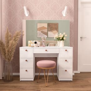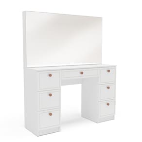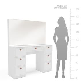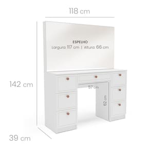 A Penteadeira Pérola 7 Gavetas Branco Yescasa é a escolha ideal para quem deseja unir beleza, funcionalidade e um toque de sofisticação ao espaço de autocuidado. Com design inspirado na mesma linha da cozinha Pérola — uma das mais vendidas do site —, ela traz elegância em cada detalhe, desde os puxadores na sofisticada cor cinza até a finalização das gavetas com usinagem refinada, que conferem um acabamento moderno e exclusivo. Com 118 cm de largura, 142 cm de altura e 39 cm de profundidade, oferece amplo espaço para organizar maquiagens, acessórios e itens pessoais com praticidade. A Penteadeira Pérola é mais do que um móvel; é um convite diário ao cuidado consigo mesma, sem abrir mão de estilo e personalidade. Acabamento da Gaveta: Finish Foil Acompanha Banqueta: Não Altura do Espelho: 66 cm Ambiente Principal: Quarto codigo_ean: 7900288192271 Complexidade da Montagem: Média: pode ser montado por mais de uma pessoa e/ou necessite de maior conhecimento para montagem Cor: Branco Cor do Produto: Branco Cor Interna: Branco Escala de Brilho: Semi-Fosco Escala de Brilho da Gaveta: Semi-Fosco Espessura do Espelho: 3 mm Fita Integrada: Sim Formato do Espelho: Retangular Gaveta com Chave: Não Itens Inclusos: 1 Penteadeira, Kit de Ferragens, Manual de Montagem e Termo de Garantia Largura do Espelho: 117 cm Linha ou Coleção: Pérola Manual de Montagem e Instalação: https://product-hub-prd.madeiramadeira.com.br/470776279/documents/01b1422b-8d38-4554-a8ef-425ec218fa823062605622417521704380113.pdf Marca: Yescasa Material da Gaveta: MDP Material do Puxador da Gaveta: Plástico Material Principal: MDP Necessita Montagem: Sim Origem do Produto: Nacional Peso: 38 kg Peso Máximo por Gaveta: 3 kg Possui iluminação: Não Possui Pés: Não Possui Porta Objetos: Não Possui Portas: Não Possui Prateleiras: Não Quantidade de Espelho: 01 Recomendações de Uso, Manutenção e Limpeza: Utilize um pano macio umedecido com água e sabão neutro, seguido de pano seco. Não utilize produtos químicos ou abrasivos para limpeza, pois estes danificam o revestimento do móvel. Sapatas Niveladoras: Sim Sistema de Montagem: Cavilha, Parafuso, Minifix e prego Suporta Até (kg): 30 kg Tipo de Corrediça da Gaveta: Metálica Simples Tipo de Fixação do Espelho: Fita Dupla Face Tipo de Puxador da Gaveta: Externo