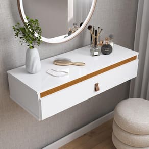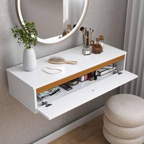 Elegante e funcional, a penteadeira suspensa é perfeita para otimizar espaços com estilo. Com detalhes na cor Freijó, ela combina modernidade e sofisticação. O design compacto com uma porta espaçosa oferece praticidade para organizar maquiagens, acessórios e itens de cuidado pessoal. Ideal para quartos pequenos ou ambientes minimalistas, o modelo conta ainda com um puxador em alça de couro, que dá um toque de charme e exclusividade.