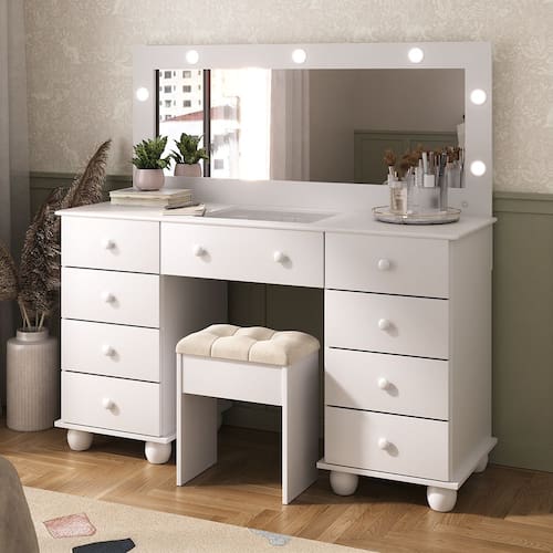 Quebra de Objeção Muitos clientes têm dúvidas sobre espaço interno e conforto. Essa versão resolve os dois pontos: a penteadeira conta com 9 gavetas amplas, garantindo organização completa, enquanto a banqueta estofada proporciona conforto para longos momentos de uso. Além disso, o espelho com LED oferece a iluminação perfeita para maquiagem e autocuidado.