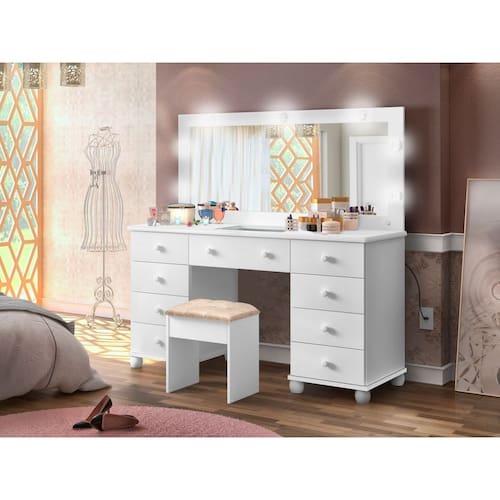 Especificações Técnicas Número de Gavetas: 9 Tipo de Iluminação: LED integrado Tipo de Espelho: Vidro com iluminação LED Altura: 135 cm Largura: 135 cm Profundidade: 46 cm