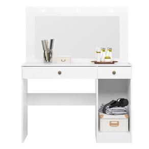 ESPECIFICAÇÕES: Estrutura em MDP Pintura UV 1 Porta Dobradiças metálicas 2 Gavetas Corrediças telescópicas Gaveta maior com divisor 3 Spots de LED Espelho fixado no painel Puxadores na cor bronze Não acompanha banqueta e acessórios