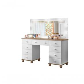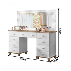 Penteadeira estilo camarim, com 9 gavetas e LED. Produto fabricado 100% em MDF, com vidro para visão ao porta joias, gaveta com porta joias, corrediças telescópicas, pés em madeira, espelho com moldura, suporta Até 36 kg e acompanha 7 lâmpadas.