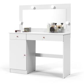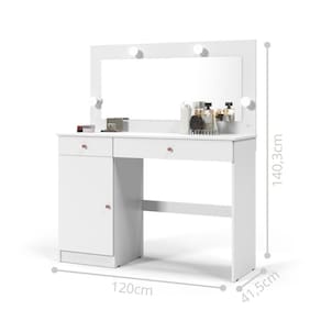 Feito em MDF. Contém 2 gavetas, 1 porta, afiação elétrica, espelho, soquetes para lâmpadas e