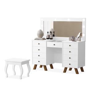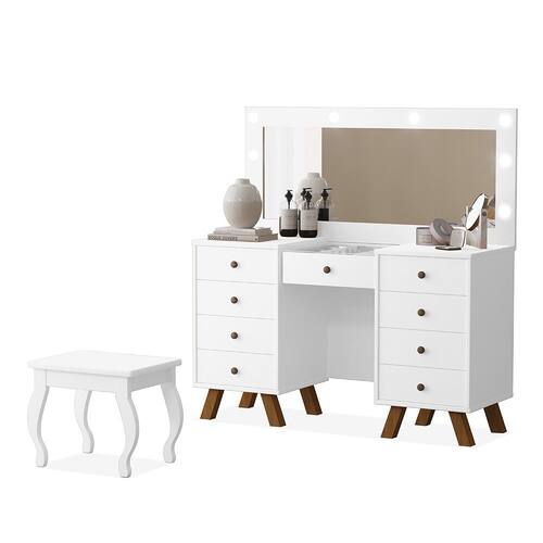 Características: Estrutura em MDF e MDP 09 Gavetas com Corrediças Telescópicas Puxador Metalizado Fosco Pés em Madeira Tampo de Vidro Incluso Espelho e Kit Led ACOMPANHA BANQUETA