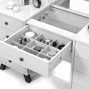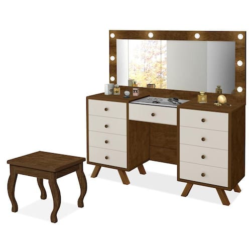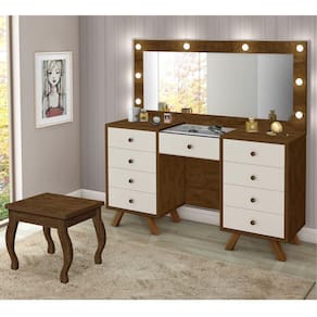 Estrutura: MDF/MDPAcabamento: Pintura U.V, anti-riscoGavetas: Sim, 09 gavetas com corrediças telescópicas, frente em MDF 15 mm, sendo a gaveta central com colméia para organizar e guarda suas joias, relógiosTampo: Vidro, para melhor visualização do separador de joias da gavetaEspelho: Sim, no quadro central de 3 mm de espessura e moldura do espelho em MDF 15 mm e 20 mmQuadro: Com espelho, 08 jogos de lâmpadas de LED (lâmpadas já inclusa), para uma maquiagem e iluminação perfeitaPuxadores: Sim, em metal com acabamento envelhecidoPés: Sim, em madeira de reflorestamentoBanqueta: Sim, inclusaDimensões do produto montado