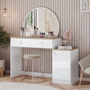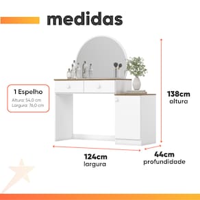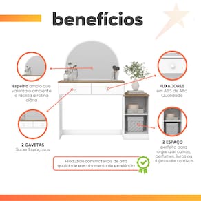 A Penteadeira Verônica foi desenvolvida para unir praticidade, organização e sofisticação, transformando sua rotina de cuidados e maquiagem em um momento ainda mais especial. Seu espelho amplo e redondo garante maior visibilidade, facilitando cada detalhe na hora de se arrumar. Com 2 gavetas super espaçosas com corrediças telescópicas, oferece o espaço ideal para organizar maquiagens, perfumes, cosméticos, acessórios e até mesmo selecionar com facilidade o look perfeito para qualquer ocasião. Versátil, pode ser instalada em quartos, closets ou estúdios, adaptando-se a diferentes ambientes com elegância. Produzida com materiais de alta qualidade, possui acabamento resistente e puxadores em ABS, que unem durabilidade e modernidade em um único móvel.