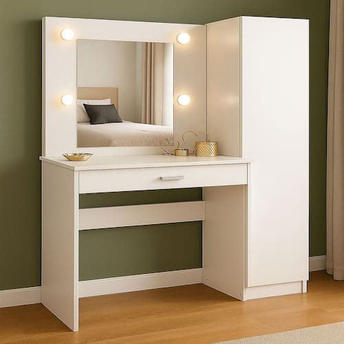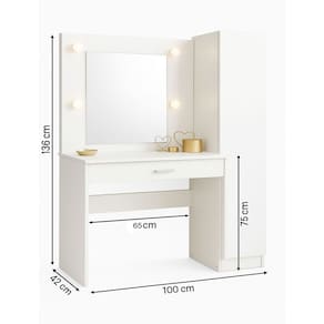 Com espelho iluminado estilo camarim, gaveta grande e porta com prateleiras internas, essa penteadeira é perfeita para quem busca funcionalidade com design moderno.