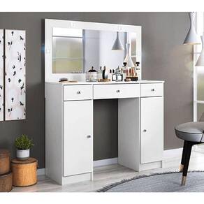 Penteadeira Camarim Carisma 2 Portas E 3 Gavetas Com Espelho E Led 5950 Demóbile Branco 220v Modelo desenvolvido especialmente para facilitar e organizar pertences de maquiagem e beleza, oferecendo um amplo espelho iluminado por quatro leds, três gavetas sendo a central com corrediças telescópicas e divisor para objetos, além de dois compartimentos com portas para acomodação de pertences maiores.