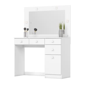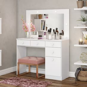 A Penteadeira Camarim Magnolia foi desenvolvida para unir praticidade, organização e sofisticação, transformando sua rotina de cuidados e maquiagem em um momento ainda mais especial. Seu espelho amplo com iluminação em LED garante maior brilho e visibilidade, facilitando cada detalhe na hora de se arrumar. Com 4 gavetas super espaçosas e um nicho lateral, oferece o espaço ideal para organizar maquiagens, perfumes, cosméticos, acessórios e até mesmo selecionar com facilidade o look perfeito para qualquer ocasião. Versátil, pode ser instalada em quartos, closets ou estúdios, adaptando-se a diferentes ambientes com elegância. Produzida com materiais de alta qualidade, possui acabamento resistente e puxadores em ABS, que unem durabilidade e modernidade em um único móvel.