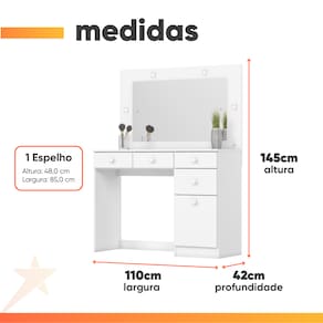 MEDIDAS: [ A ] = 145 cm [ L ] = 110 cm [ P ] = 42 cm MEDIDAS DO ESPELHO: [ A ] = 48 cm [ L ] = 85 cm PESO: 36 kg GAVETA SUPORTA: 3 kg PENTEADEIRA SUPORTA ATÉ: 25 kg MODELO: Penteadeira com Espelho LED 4 Gavetas 1 Porta Magnólia MARCA: Henn MATERIAL: MDP ESPESSURA DO MATERIAL DA ESTRUTURA: 15mm e 12mm ESPESSURA DO TAMPO: 2 cm ACABAMENTO: Pintura UV Texturizada POSSUI LUZ LED: Sim POSSUI ESPELHO: Sim PORTAS: 1 TIPO DE PORTA: Bater DOBRADIÇA: Metálica GAVETAS: 4 PUXADOES: ABS QUANTIDADE DE PUXADORES: 5 CORREDIÇAS: Metálicas PÉS: Sapatas plásticas GARANTIA: 03 meses ITENS INCLUÍDOS: 01 Penteadeira, 01 manual de montagem e Kit Parafusos DIFERENCIAL: Espelho com iluminação em Led INSTRUÇÕES E CUIDADOS: Para limpeza de seu móvel, use uma flanela limpa e seca. Não utilize produtos químicos que possam danificar o produto.