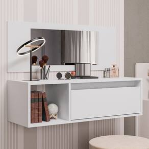 Com design minimalista, essa penteadeira suspensa, além de otimizar espaço de circulação, ainda conta com uma gaveta com divisórias, ideal para organizar os itens de maquiagens, produtos skincare e demais acessórios de beleza. Já o nicho é um ótimo aliado para dispor alguma decoração e deixar o espaço ainda mais acolhedor. Ahh, lembrando que é uma penteadeira com espelho, ou seja, um móvel completo para você se olhar e se sentir ainda mais bela e incrível.