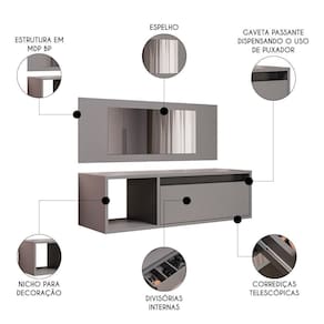 Com design minimalista, essa penteadeira suspensa, além de otimizar espaço de circulação, ainda conta com uma gaveta com divisórias, ideal para organizar os itens de maquiagens, produtos skincare e demais acessórios de beleza. Já o nicho é um ótimo aliado para dispor alguma decoração e deixar o espaço ainda mais acolhedor. Ahh, lembrando que é uma penteadeira com espelho, ou seja, um móvel completo para você se olhar e se sentir ainda mais bela e incrível.