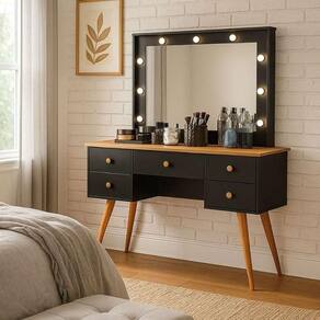 Beleza, praticidade e charme se encontram na Penteadeira Camarim Anaísa. Produzida 100% em MDF, ela une qualidade e durabilidade com um design sofisticado, ideal para transformar seu quarto ou closet em um verdadeiro camarim.Equipada com um amplo espelho central cercado por iluminação em LED, proporciona uma excelente visibilidade para maquiagem e cuidados diários. São 5 gavetas espaçosas para organizar maquiagens, acessórios e itens pessoais com praticidade.O toque final fica por conta dos elegantes pés palito em madeira maciça, que remetem ao estilo retrô e adicionam um charme especial à decoração.Destaques do produto:-Produzida 100% em MDF: mais resistência e durabilidade;-Espelho amplo com iluminação em LED embutida;-5 gavetas funcionais com amplo espaço interno;-Pés palito em madeira no estilo retrô;-Design moderno e elegante.Ideal para quem busca um móvel funcional e cheio de estilo para o dia a dia!MEDIDAS DO PRODUTO MONTADO:Altura: 150 cm;Largura: 45 cm;Comprimento: 136 cm.NÃO NOS RESPONSABILIZAMOS PELA MONTAGEM DO PRODUTO, ACONSELHAMOS QUE A MESMA SEJA FEITA POR UM PROFISSIONALPRODUTO COM GARANTIA DE ATÉ 3 MESES