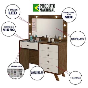 Penteadeira camarim com led e espelho luna malbec off whiteA penteadeira luna é 100% mdf, sua pintura é uv anti risco, puxadores em metal com acabamento envelhecido, corrediças telescópicas, possui colmeia na gaveta central, bases laterais e tampo mdf 18mm, moldura do espelho mdf 15mm e 20mm, o espelho tem 3mm e o vidro do tampo 4mm. Possuindo 6 led de luz branca, pés em madeira de reflorestamento e 5 gavetas com a frente em mdf 15mm.CaracteristicasTipo: penteadeira camarimModelo: lunaCor: malbec off whiteDimensões do produtoAltura: 145cmLargura: 93,5cmComprimento: 43cmObservaçãoNão acompanha banqueta (vendida separadamente)Imagens interna do produto corresponde ao modelo e não a corNecessita de montagem (fica por conta do cliente)Imagens meramente ilustrativasPenteadeira Camarim com Led e Espelho Luna Malbec Off White