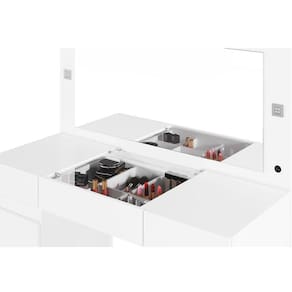 Na hora de se arrumar é importante ter um espaço dedicado só para isso e a Penteadeira Camarim Princess é o produto perfeito para essas horas! Com amplo espaço de armazenamento em suas 2 portas de bater e 3 gavetas com corrediças telescópicas, sendo a central um porta joias com divisórias em colmeia, espelho com amplo espaço e luminárias led que passa a vibe de um camarim de uma estrela! Um móvel incrível para o seu quarto feito com os melhores materiais do mercado! Aproveite esse e muitos outros produtos incríveis com preços acessíveis da Casa Chick!