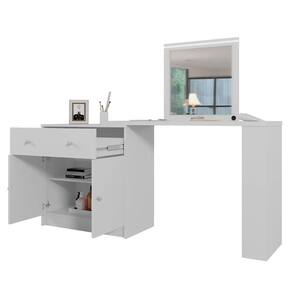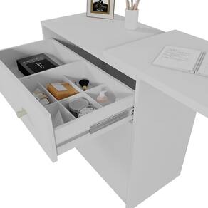 A Penteadeira Camarim de Canto Aura combina elegância e praticidade em um design moderno e funcional. Produzida em MDF e MDP com pintura UV, oferece resistência e excelente acabamento. Possui 2 portas com dobradiças metálicas, prateleira interna e 1 gaveta com corrediças telescópicas e colmeia organizadora. Conta ainda com perfil de LED com iluminação embutida e espelho de 3mm que proporcionam um toque sofisticado. O tampo móvel permite escolher o lado da montagem, adaptando-se facilmente ao espaço. Completa com mini estante para objetos e puxadores pontuais, é ideal para quem busca beleza e organização em um só móvel.