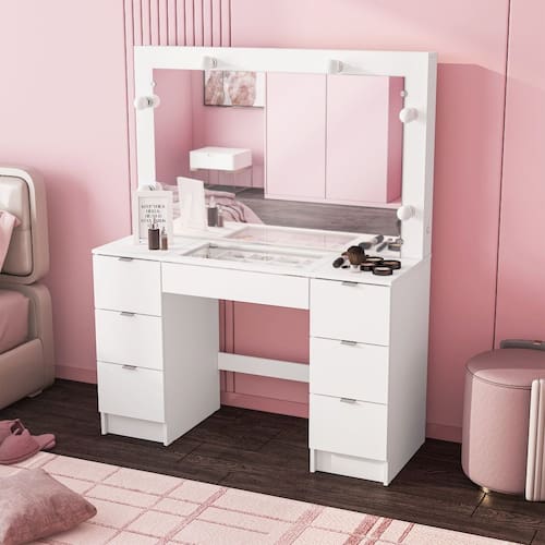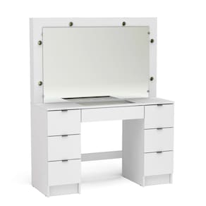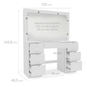 Características: Estrutura MDP Pintura BP/UV 07 Gavetas com corrediças metálicas Suporte para 06 lâmpadas Puxadores de Metal Peso suportado no Tampo: 10kg Peso suportado na Gaveta: 3kg NÃO ACOMPANHA LÂMPADAS Compatível com lâmpadas bulbo LED modelo E27, de 3W a 6W de potência
