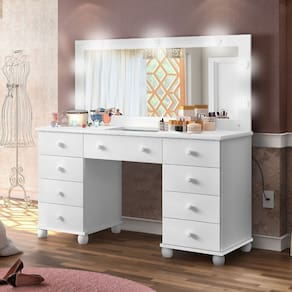 Dê um toque organizado ao seu espaço com a Penteadeira Camarim 9 Gavetas com LED . O modelo possui espelho com iluminação integrada e gavetas que contribuem para acomodar itens pessoais de forma prática.
