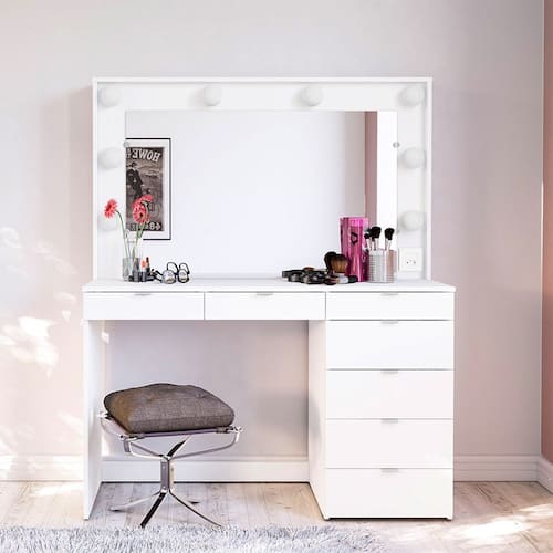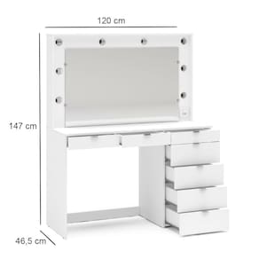 Características: Estrutura MDP Pintura UV 08 Gavetas com corrediças metálicas Suporte para 08 lâmpadas Puxadores de Metal Peso suportado no Tampo: 15kg Peso suportado por Gaveta: 3kg Não acompanha lâmpadas Compatível com lâmpadas bulbo LED modelo E27, de 3W a 6W de potência