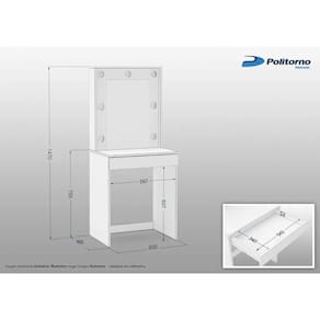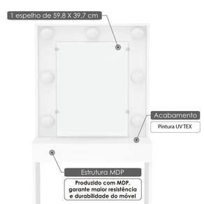 Para você que deseja inovar a decoração de seu quarto, transformá-lo em um espaço único, onde você se sentirá como uma diva, a Penteadeira Lavínia fará isso para você. Com um espelho e luzes em toda sua volta, um ambiente digno de grandes estrelas surgirá em seu quarto, um camarim de verdade! Essa peça é de tamanho compacto, sendo possível decorar pequenos ambientes. Possui um gaveta para você guardar seus produtos de beleza, ou pequenos acessórios. E para deixar sua montagem mais fácil, disponibilizamos à você um site com imagens do passo a passo para você mesmo fazer esse trabalho. Se você quer dar um op grade na decoração do seu quarto, transformá-lo em um local personalizado, de elevado astral, a Penteadeira Lavínia tem que fazer parte desse ambiente.