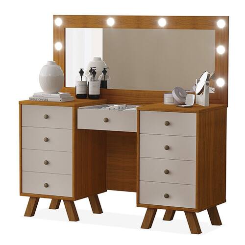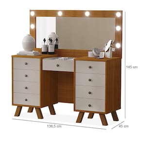 Características: Estrutura em MDF e MDP 09 Gavetas com Corrediças Telescópicas Puxador Metalizado Fosco Pés em Madeira Tampo de Vidro Incluso Espelho e Kit Led NÃO ACOMPANHA BANQUETA