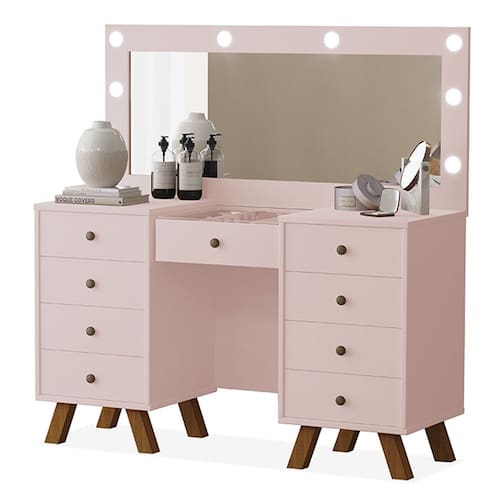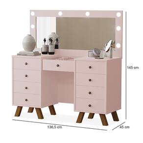 Características: Estrutura em MDF e MDP 09 Gavetas com Corrediças Telescópicas Puxador Metalizado Fosco Pés em Madeira Tampo de Vidro Incluso Espelho e Kit Led NÃO ACOMPANHA BANQUETA