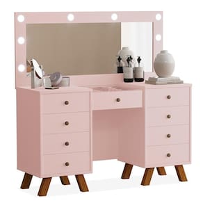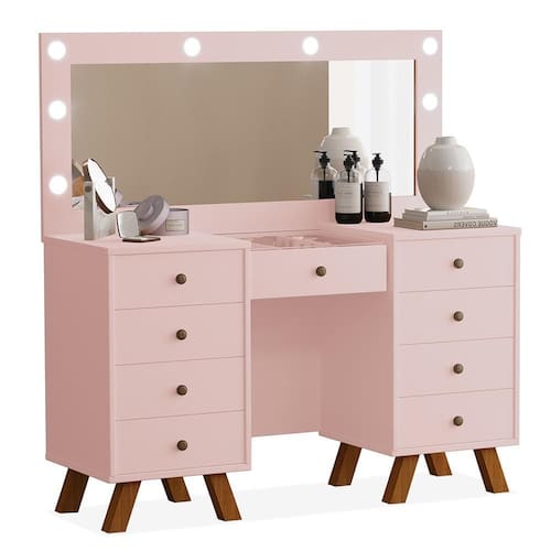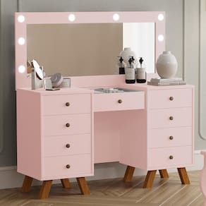 ESPECIFICAÇÕES: Estrutura em MDF Pintura UV 9 Gavetas Corrediças telescópicas Colmeia na gaveta central Vidro no tampo da gaveta central Puxadores em metal acabamento envelhecido 8 Lâmpadas de LED Incluso espelho Pés em madeira de reflorestamento Não acompanha banqueta