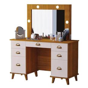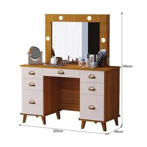 Descubra a elegância e funcionalidade da Penteadeira Camarim New Seul. Feita com uma mistura de MDP e MDF de alta qualidade, esta peça é o complemento perfeito para o seu espaço de beleza. Sua pintura UV confere durabilidade e estilo, enquanto suas 7 gavetas, equipadas com corrediças telescópicas, oferecem amplo espaço para organizar seus itens de maquiagem e acessórios. A gaveta central, com um nicho especial, é ideal para guardar suas jóias e itens mais preciosos. Os puxadores retrô adicionam um toque de charme vintage e os pés de madeira garantem estabilidade e robustez. Desfrute de uma iluminação perfeita com o quadro equipado com 4 jogos de lâmpadas de LED, tomada, interruptor da lâmpada e chicote de energia já inclusos. Além disso, o espelho incluso completa o conjunto, tornando a sua experiência de beleza ainda mais completa e glamorosa.