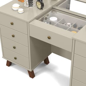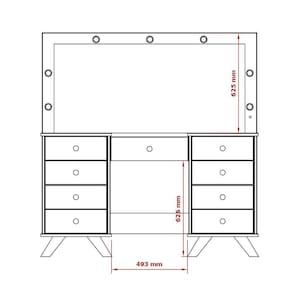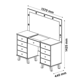 A Penteadeira Camarim Eloá é um móvel bastante útil que vai agregar beleza, luxo e sofisticação ao seu quarto. Possui estrutura em mdf de excelente qualidade que proporciona maior durabilidade e resistência ao produto, conta com 9 gavetas sendo a central com colmeia e amplo espaço interno para maior organização dos seus pertences. Designer moderno desenvolvida para lhe proporcionar maior visibilidade na hora de fazer a sua maquiagem, pois conta com leds de alta qualidade.