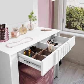 A Penteadeira Camarim Rouge - Bechara Móveis conta com iluminação em LED para uma luz uniforme e suave, ideal para maquiagem. Seu design moderno é realçado por um espelho de formato orgânico, combinando estética e funcionalidade. Com uma gaveta de abertura total e deslizamento suave, você tem acesso fácil a todos os itens, além de uma gaveta organizadora para manter maquiagem e acessórios sempre arrumados e bonitos.Dimensões do Produto Montado:Altura: 156cmLargura: 90cmComprimento: 43,5cmObservações:– Iluminação em LED– Gaveta com corrediças telescópicas– Gaveta organizadora– Espelho orgânicoMarca: Bechara MóveisModelo: Camarim RougeReferência: 2076695WATENÇÃO: Não nos responsabilizamos pela montagem deste produto. Aconselhamos a contratação de um profissional.